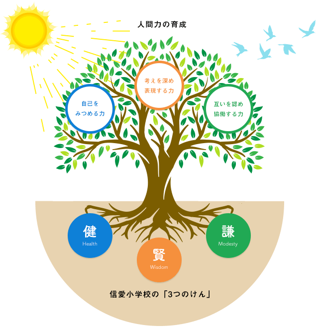 大阪信愛学院小学校は、長く教育目標として掲げてきた「3つのけん(健・謙・賢)」をベースに、知・徳・体のバランスのとれた、「人としての基礎・基本を大切にし、社会の中で輝く子ども」「未来に向かって挑戦する子ども」の育成を目指しています。