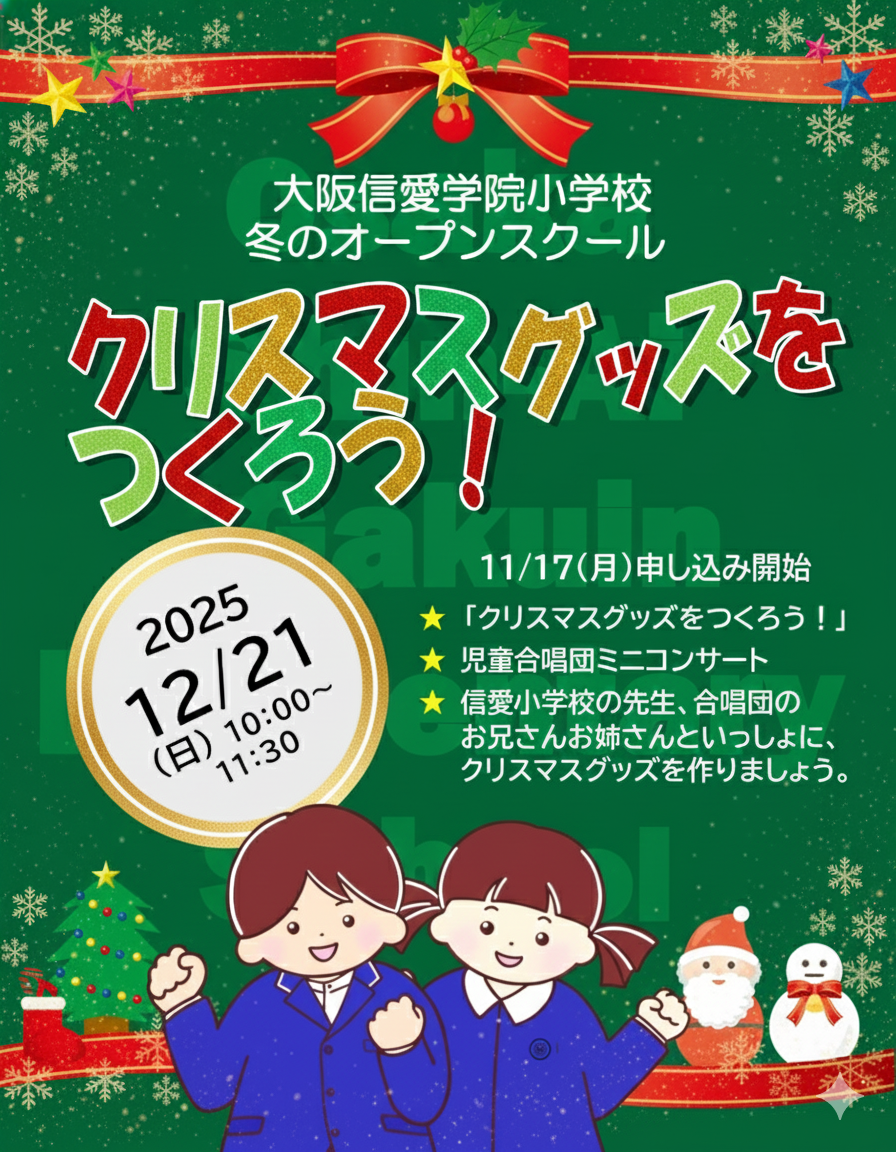 今回のオープンスクールでは、クリスマスグッズ作りや児童合唱団によるミニコンサートを、園児の皆さんに体験していただきます。