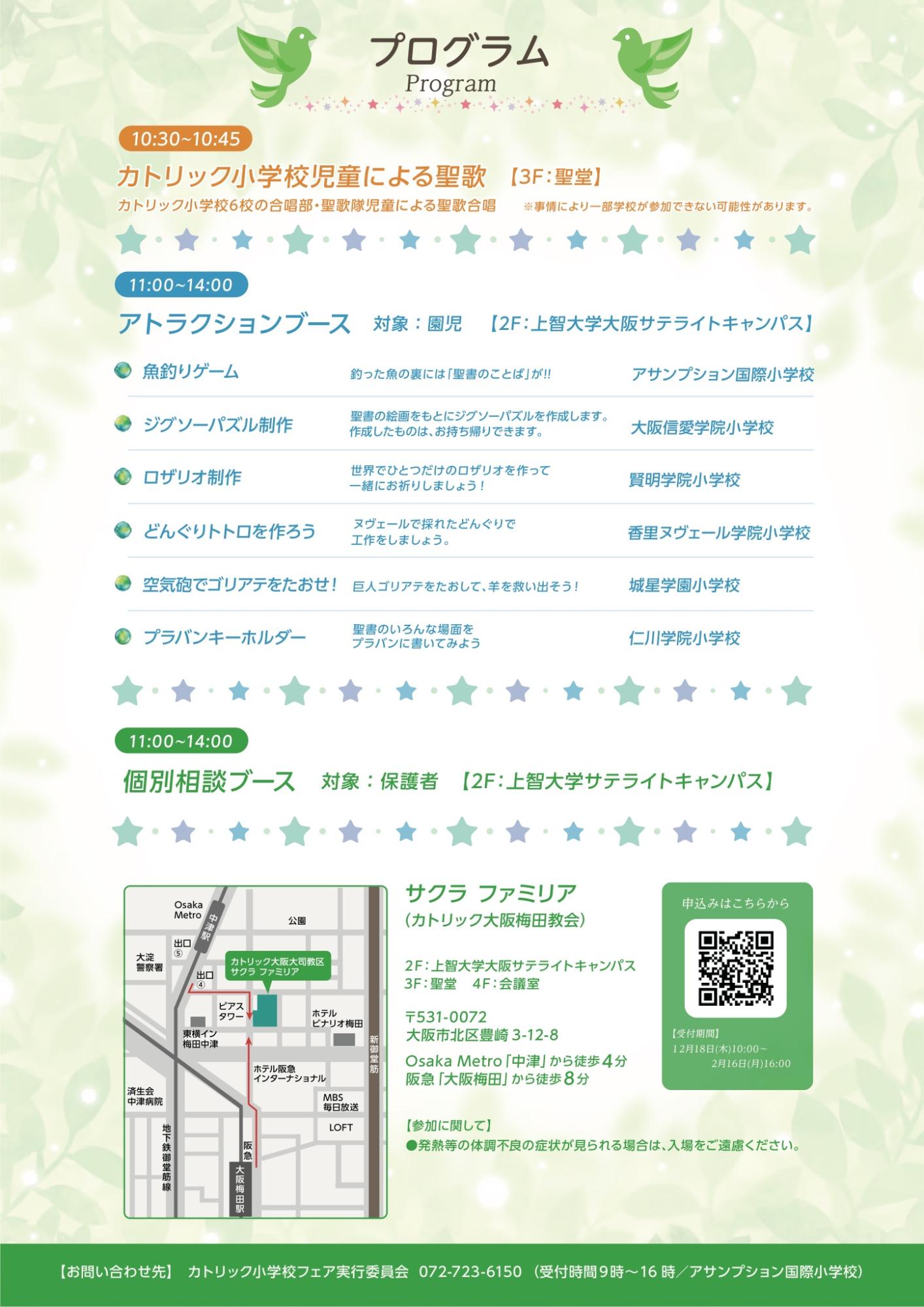 2026.01.26 入試情報 カトリック小学校フェアのご案内 2月23日(月祝)カトリック大阪梅田教会(サクラファミリア)にて、 本校を含む関西のカトリック系小学校6校が集う「カトリック小学校フェア」が開催されます。当日は、各校児童合唱団による聖歌の合唱発表をはじめ、園児の皆さんが参加できるイベントや個別相談会など、盛りだくさんの内容をご用意しております。ご参加には事前申し込みが必要です。下記よりお申し込みください。みなさまのご来場を心よりお待ちしております。 お申し込みはこちら